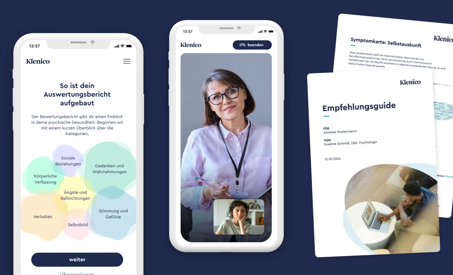 Das Klenico-System ermöglicht einen einfachen Einstieg in die psychische Gesundheitsversorgung. Betroffene erfassen eigenständig ihre Belastungen & durchlaufen einen individuellen Screening-Prozess. Im anschließenden Videocall erhalten sie persönliches Feedback durch eine therapeutische Fachperson und konkrete Empfehlungen für passende Unterstützungsangebote. So entsteht eine effektive, frühzeitige Versorgung. Die digitale, adaptive Erhebung liefert eine visuelle Symptomkarte und Diagnosevorschläge nach ICD-10 und DSM-5.
